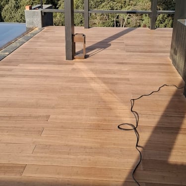 Disfruta de la belleza y resistencia de la tarima maciza de exterior. Un elegante suelo de madera diseñado para terrazas y zonas al aire libre, combinando estilo y durabilidad. La instalación resalta la calidez de la madera natural, perfectamente adaptada para soportar las condiciones exteriores, manteniendo un acabado impecable Ideal para crear ambientes acogedores en espacios exteriores con vistas espectaculares.